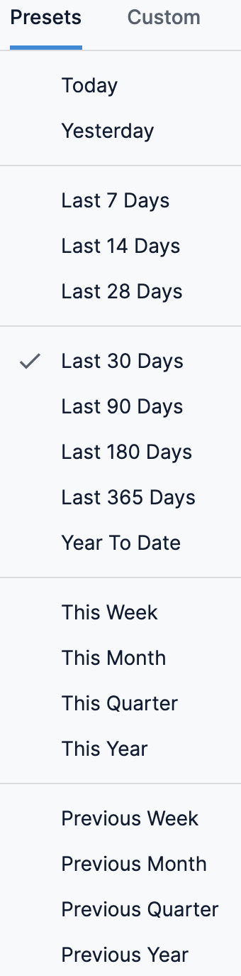 • Presets: Select a Preset filter. For example, Today, Yesterday, etc.