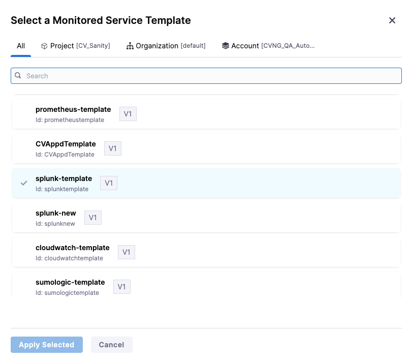 You can configure the monitored service template in the Verify step configuration. You can select whether you want to use Default or Template for verification.
